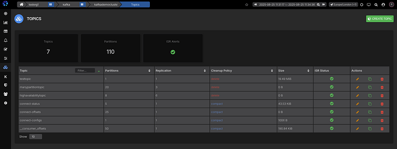 New topics can be created with advanced configurations, giving you full control over settings like partition count, replication factor, retention policies.