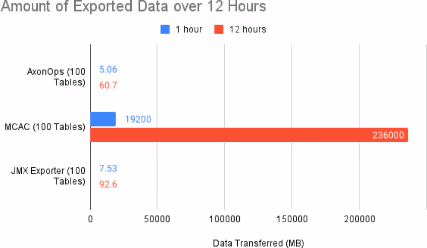 MCAC, however, was a data firehose, sending 19.2 GB of data over 1 hour and 236 GB over 12 hours when monitoring 100 tables. By comparison, this is about 4,000x more data than what the AxonOps agent exports. This bandwidth would ideally be used to serve public requests, not gather internal health metrics while potentially increasing bandwidth charges.