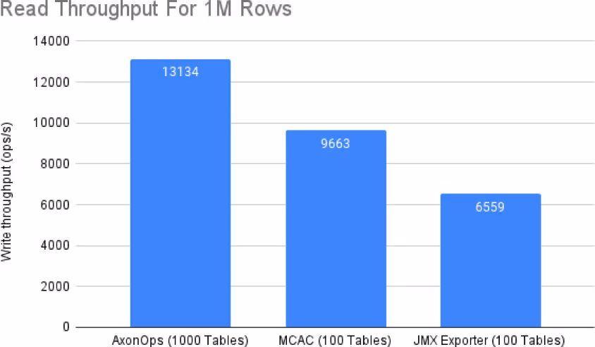 Usually, writing to Cassandra is limited by the CPU, while reading is limited by disk throughput. So, I thought the read speed would be about the same for the Cassandra clusters tracked by the AxonOps agent and MCAC exporter since 1 million read operations would apply disk pressure rather than CPU pressure.