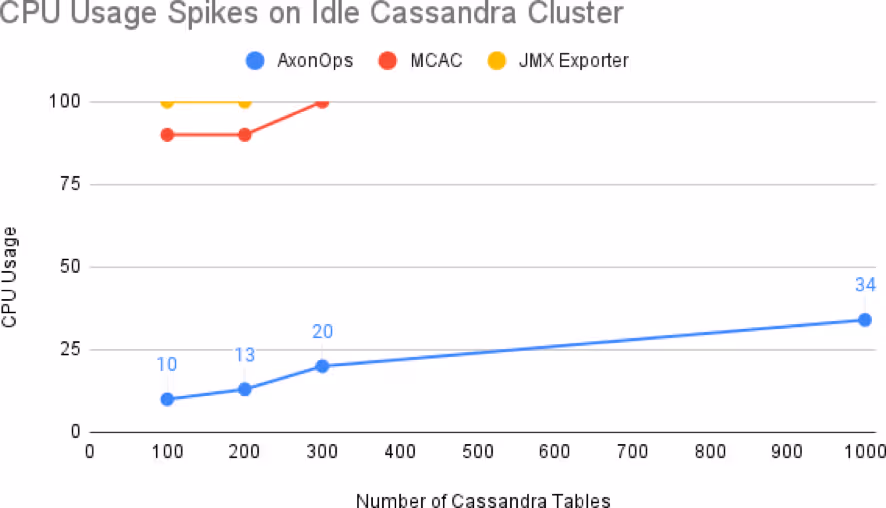 The majority of clusters typically have 100 tables or less. However, it is commonplace to have clusters with 1000 tables or more. I have personally worked in environments with these edge cases and being able to effectively monitor them with AxonOps is truly impressive. While this test is being run on nodes with 2 CPUs, the JMX Exporter may not be ideal for some enterprise-level configurations without proper performance testing.