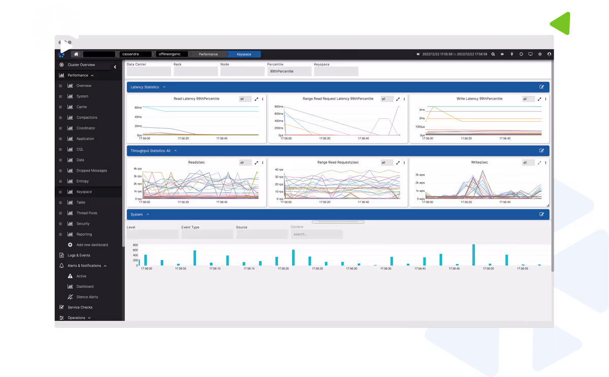 Decide what to be alerted on and assign thresholds to ensure you always preempt potential issues and quickly pursue Cassandra performance tuning opportunities.