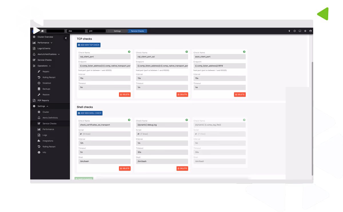 Fully customisable and scheduled service checks enabling you to perform any check you want on the underlying system to ensure it is as expected and alert you should the check fail. Call it the 24×7 expert heartbeat for Cassandra performance monitoring.
