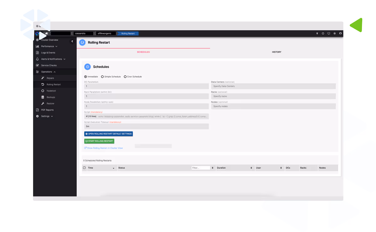 Need to perform a restart of your cluster without impacting your applications? AxonOps has you covered. You can choose strategies to intelligently restart your cluster based on how it's been deployed to avoid client impact. Schedule the restart to run overnight and receive progress notifications as you need via AxonOps integrations.