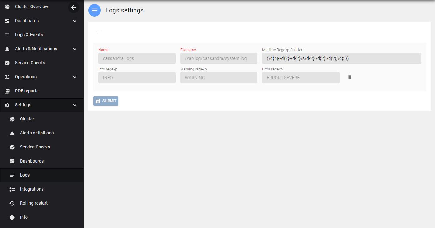 AxonOps dashboards provides a comprehensive set of charts with an embedded view for logs and events. The goal is to correlate metrics with logs/events as you can zoom in the logs histogram or metrics charts to drill down both results.