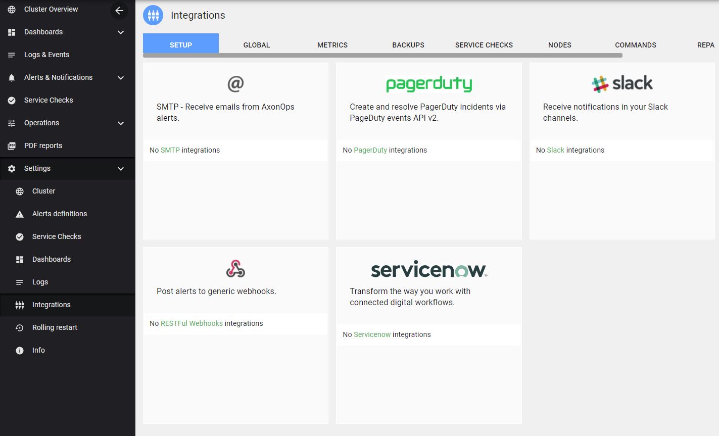 On the Axonops application menu, select Settings -> Integrations .