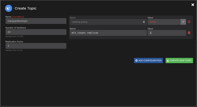 New topics can be created with advanced configurations, giving you full control over settings like partition count, replication factor, retention policies.