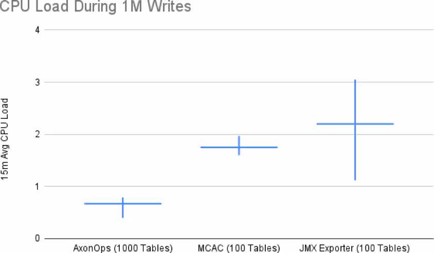 The JMX Exporter could barely monitor 100 tables, while the MCAC exporter could comfortably monitor 300 idle tables within the test environment. The AxonOps agent, on the other hand, could easily monitor more than 1000 tables while causing a 15-minute average load of around 0.33.