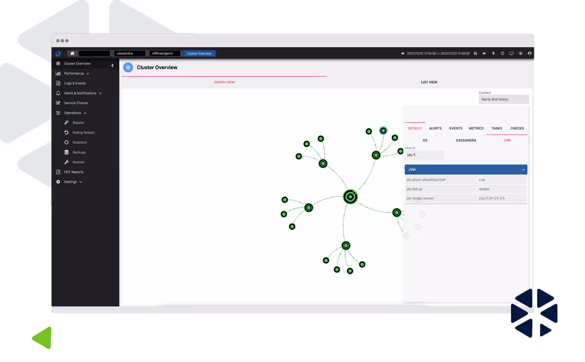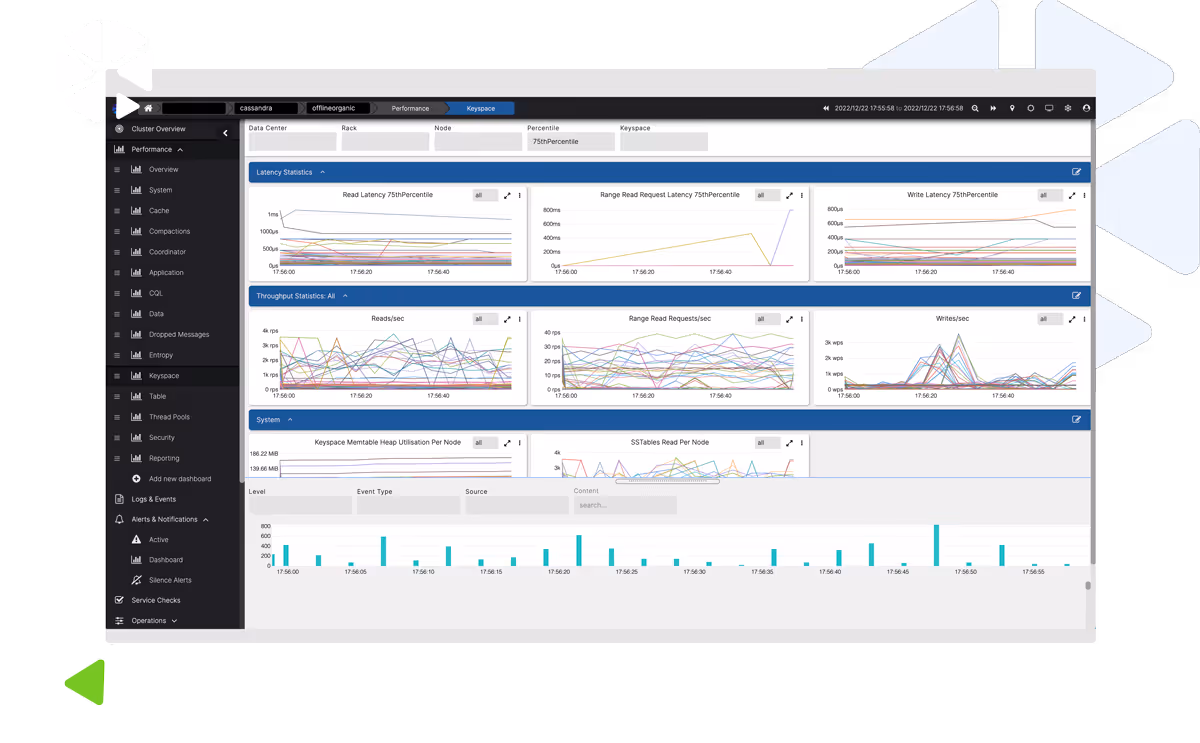 Fully customisable and scheduled service checks enabling you to perform any check you want on the underlying system to ensure it is as expected and alert you should the check fail. Call it the 24×7 expert heartbeat for Cassandra performance monitoring.