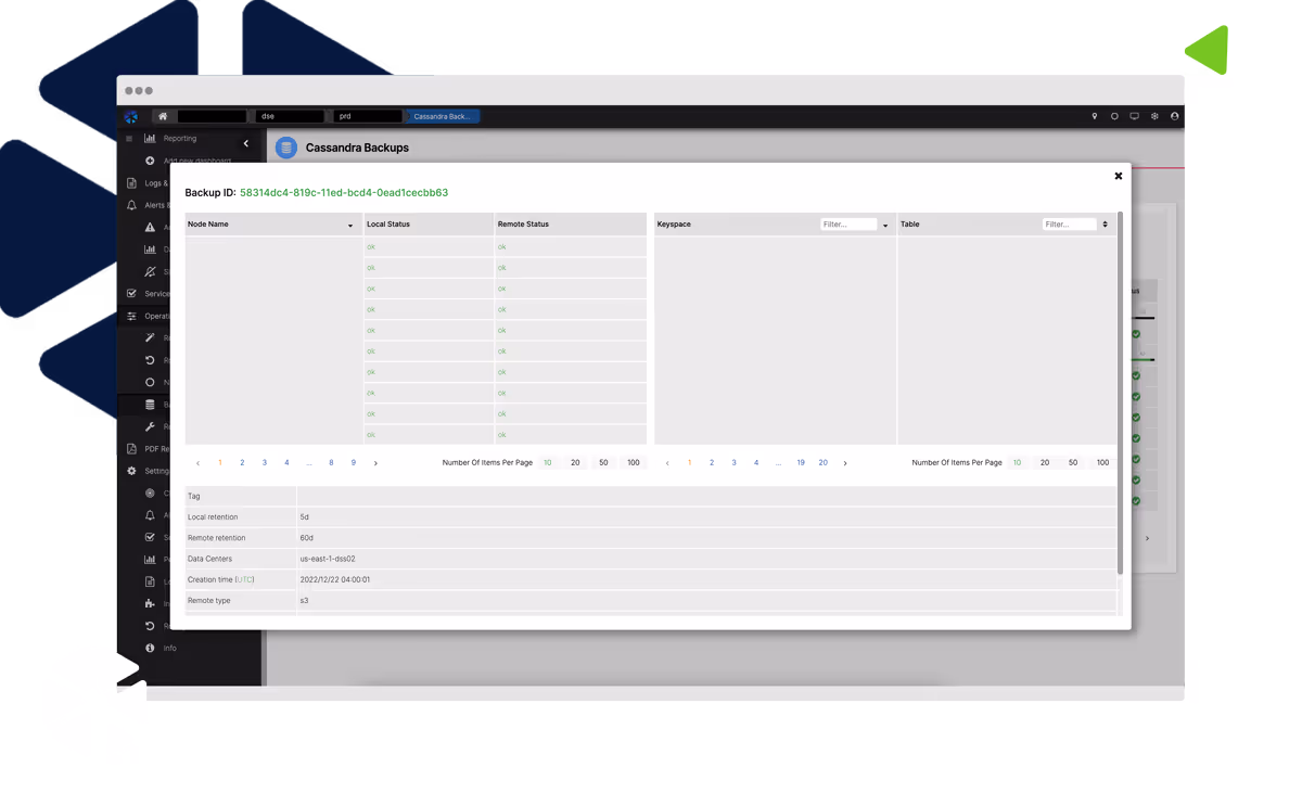 AxonOps presents a historical list of Cassandra backups, as well as the currently on-going backups in progress. Quickly understand the status of your backups for complete peace of mind.