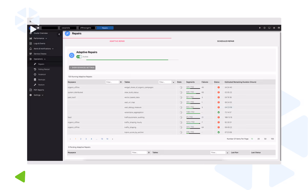 When you need to repair Cassandra for a specific operational scenario, no problem. Simply work within the intuitive UI to implement a repair job and run it now or schedule it for later. The perfect compliment to Adaptive Cassandra Repairs for those specific edge cases.